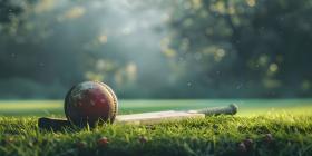 Cricket ball on the top of cricket bat on green grass of ground background - Ai Generated