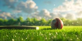 Cricket ball on the top of cricket bat on green grass of ground background - Ai Generated