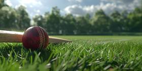 Cricket ball on the top of cricket bat on green grass of ground background - Ai Generated