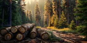 Forest pine and spruce trees Log trunks pile in forest background - Ai Generated