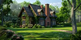 English Style Garden House with Expansive Green Lawn, Traditional English Garden House with Spacious Green Lawn - Ai Generated