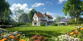 English Style Garden House with Expansive Green Lawn, Traditional English Garden House with Spacious Green Lawn - Ai Generated
