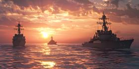 Naval Fleet in Sunset Ocean Background, Military Warships on Sea at Dusk Background - Ai Generated