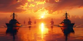 Naval Fleet in Sunset Ocean Background, Military Warships on Sea at Dusk Background - Ai Generated