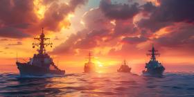 Naval Fleet in Sunset Ocean Background, Military Warships on Sea at Dusk Background - Ai Generated