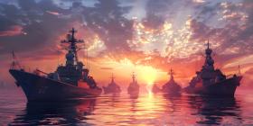 Naval Fleet in Sunset Ocean Background, Military Warships on Sea at Dusk Background - Ai Generated