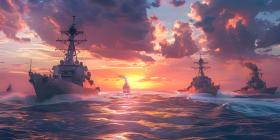 Naval Fleet in Sunset Ocean Background, Military Warships on Sea at Dusk Background - Ai Generated