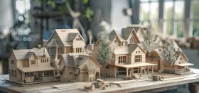 Miniature Houses on Table Background, Tabletop Model with Houses