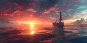 Offshore oil rig drilling platform at sunset Oil and gas platforms north sea background - Ai Generated