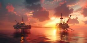 Offshore oil rig drilling platform at sunset Oil and gas platforms north sea background - Ai Generated