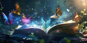 Open magic book with growing lights, magic powder and butterflies background - Ai Generated