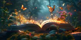 Open magic book with growing lights, magic powder and butterflies background - Ai Generated