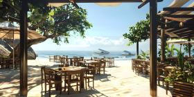 Outdoor restaurant at the beach as Tables at beach restaurant background - Ai Generated