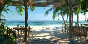 Outdoor restaurant at the beach as Tables at beach restaurant background - Ai Generated