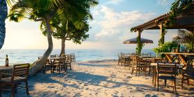 Outdoor restaurant at the beach as Tables at beach restaurant background - Ai Generated
