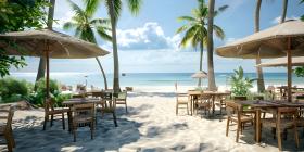 Outdoor restaurant at the beach as Tables at beach restaurant background - Ai Generated