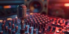 Professional studio microphone with musician blurred background and audio mixer background - Ai Generated