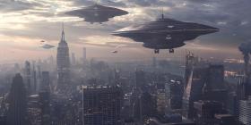 Futuristic Background with UFO Invasion Over the City, UFO Invasion on Futuristic City Background - Ai Generated