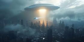 Futuristic Background with UFO Invasion Over the City, UFO Invasion on Futuristic City Background - Ai Generated