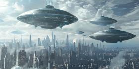Futuristic Background with UFO Invasion Over the City, UFO Invasion on Futuristic City Background - Ai Generated