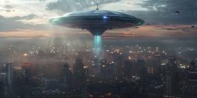 Futuristic Background with UFO Invasion Over the City, UFO Invasion on Futuristic City Background - Ai Generated
