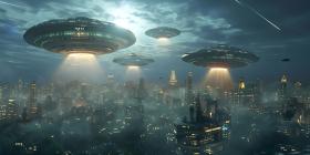 Futuristic Background with UFO Invasion Over the City, UFO Invasion on Futuristic City Background - Ai Generated