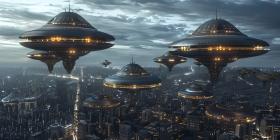 Futuristic Background with UFO Invasion Over the City, UFO Invasion on Futuristic City Background - Ai Generated