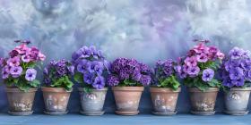 Blue and Violet Flowers in Pots in a row background - Ai Generated