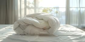 Folded Duvet Lying on White Bed background - Ai Generated