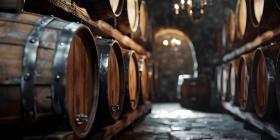 Wine Barrels in an Old Dark Wine Cellar Stack background - Ai Generated