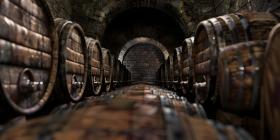 Wine Barrels in an Old Dark Wine Cellar Stack background - Ai Generated