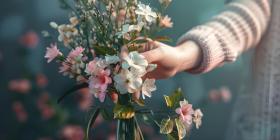 Woman Hand Holding Bunch of Spring Flowers background - Ai Generated