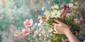 Woman Hand Holding Bunch of Spring Flowers background - Ai Generated