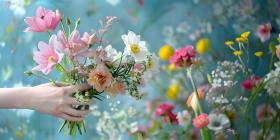 Woman Hand Holding Bunch of Spring Flowers background - Ai Generated