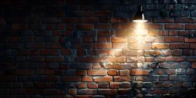 Hanging spotlight illuminate at brick dark wall background with copy space - Ai Generated