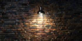 Hanging spotlight illuminate at brick dark wall background with copy space - Ai Generated