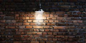 Hanging spotlight illuminate at brick dark wall background with copy space - Ai Generated