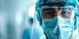 Medical Doctor smiling at camera in hospital with copy space for text background - Ai Generated