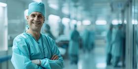Medical Doctor smiling at camera in hospital with copy space for text background - Ai Generated