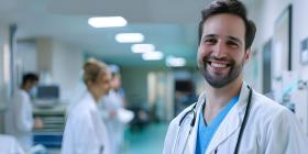 Medical Doctor smiling at camera in hospital with copy space for text background - Ai Generated