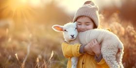 Child hugging a lamb on natural background - Ai Generated