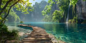 Beautiful wooden path trail for nature trekking with lakes and w