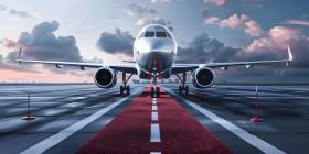 Boarding commercial airplane with red carpet at airport backgrou