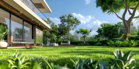 Beautiful House With Green Grass Yard background - Ai Generated