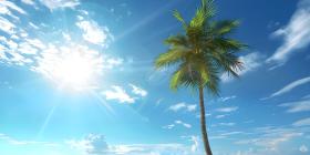 Beautiful Coconut Palm tree with blue sky and sun background - A