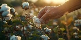 Farmer hand picking white boll of cotton background - Ai Generated