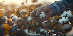 Farmer hand picking white boll of cotton background - Ai Generated
