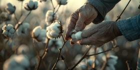 Farmer hand picking white boll of cotton background - Ai Generated
