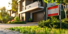 For sale sign board outside house background, House for sale concept - Ai Generated