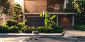 For sale sign board outside house background, House for sale concept - Ai Generated